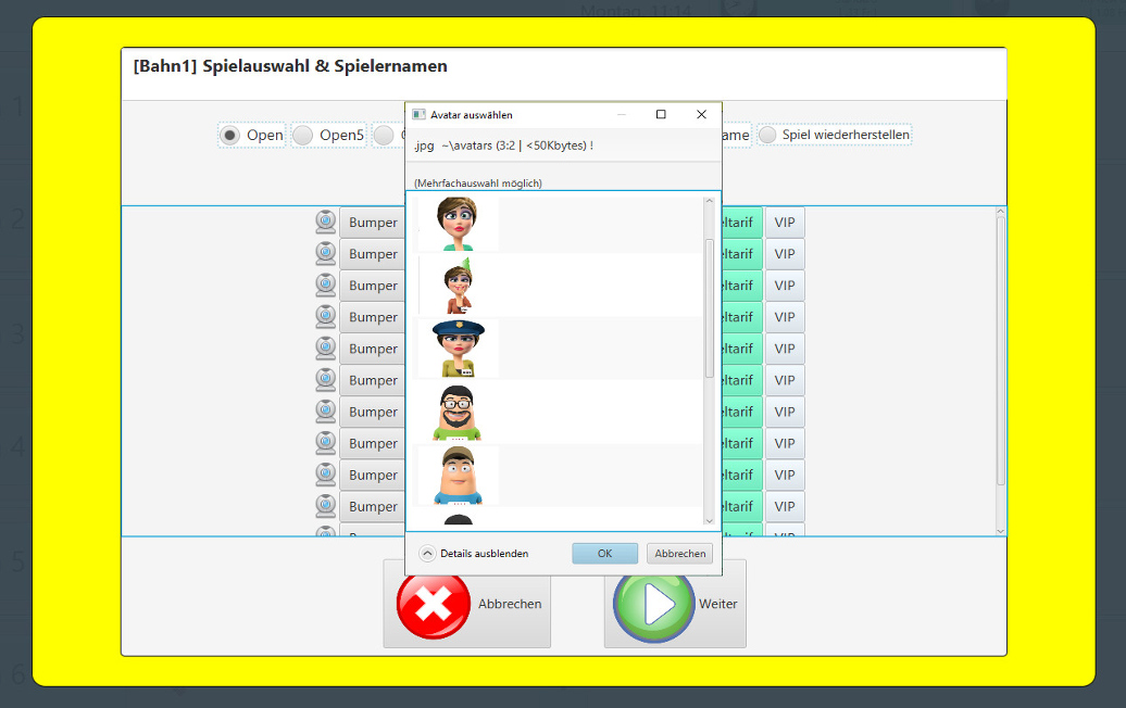 Spielstände korrigieren, Spieler hinzufügen / löschen, Spielarten wählen, Bumper aktivieren, oder komplette Bahnen transferrieren