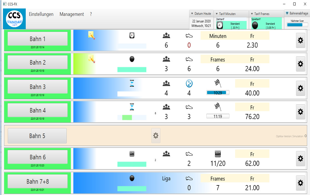 Zentrales Managementsystem zur Bewirtschaftung und Steuerung aller Bowlingbahnen. Verschiedene Abrechnungsmethoden und sehr detaillierte Zusammenfassungen der Tagesrapporte