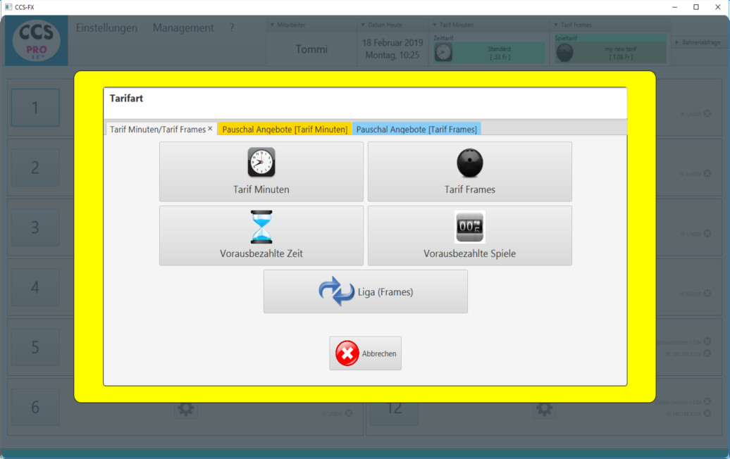 On the main screen: All lanes with number of players, shoes, game progress and current bill