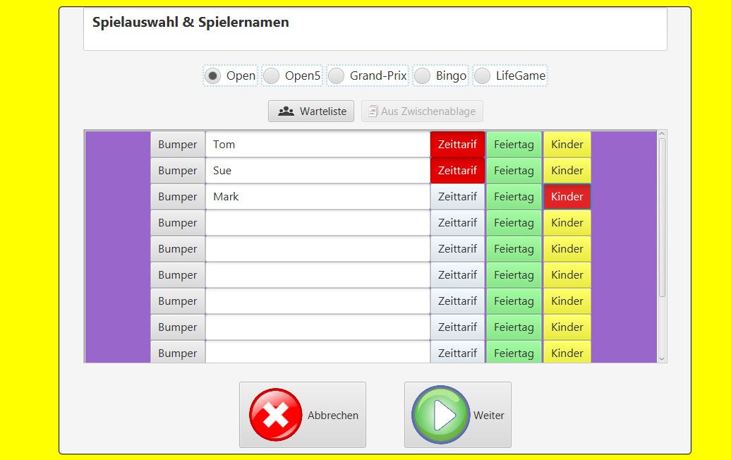 Customer-specific web interface for the entry of the players' names (customers enter their own names, the group is automatically added to the waiting list)